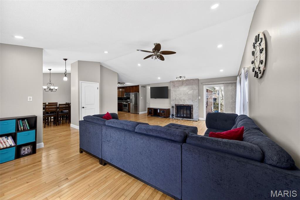So much space in this Brick front Ranch Home with just under 1,700 sq foot of living space on the Main floor alone! Walk in from the spacious covered front porch to the HUGE and wide open Great Room with vaulted ceiling, floor to ceiling wood burning fireplace, walk out slider to the backyard, and gorgeous hardwood flooring throughout the entire Main Floor!! Separate Dining Room is roomy and full of light! Kitchen is Beautifully Updated with Granite Counter Tops, Stainless appliances, 42" Mahagony Cabinets, and subway tile backsplash! Large Primary Bedroom has triple closets and an Amazing, updated Primary Bath with separate shower! Two other spacious bedrooms with wood floors and updated hall bath with full tub! Lower level contains a finished room (office, playroom, bonus, etc)! Plus TONS of open space for finishing, playing, storing, workshopping, or whatever! There is a Massive (28x20) attached 3 season room ready for Spring touches, a great yard and cul de sac for hanging out and playing!! Home has been freshly painted! New Roof! New dishwasher! Newer 200 amp panel! Your going to Love it!