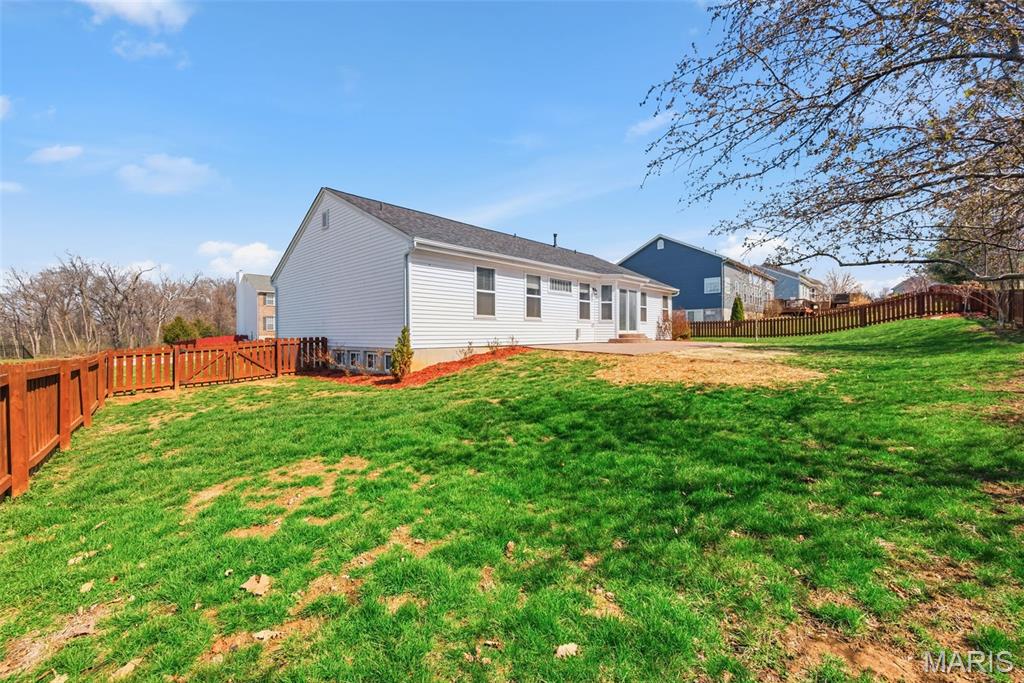 Ranch home with 3+ bedrooms, 2.5 baths. Located in Fountains at Bear Creek. Split bedroom floor plan. Vaulted ceilings in the great room with ventless gas fireplace. The kitchen offers granite counters, ceramic tile floors, under cabinet lighting, a large double door pantry and tons of cabinet space! The primary bedroom en suite has a garden tub, separate walk-in shower and 12’x7’ walk-in closet! Hardwood floors in the Great Room, Primary Bedroom and Bedrooms 2 and 3. The lower level is primarily unfinished with one possible sleeping room (has a closet but no egress) and adjoining half bath. Back yard is fenced and has a 35'x14' stamped concrete patio. Three Car Garage. Easy access to the Highways via David Hoekel Parkway and easy access to shopping.