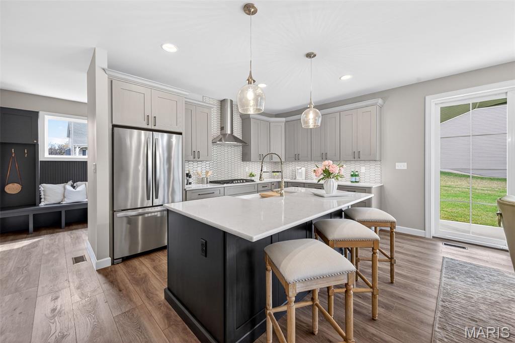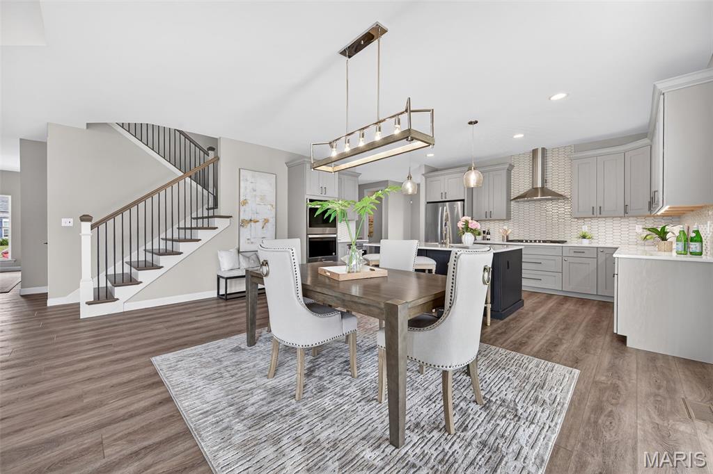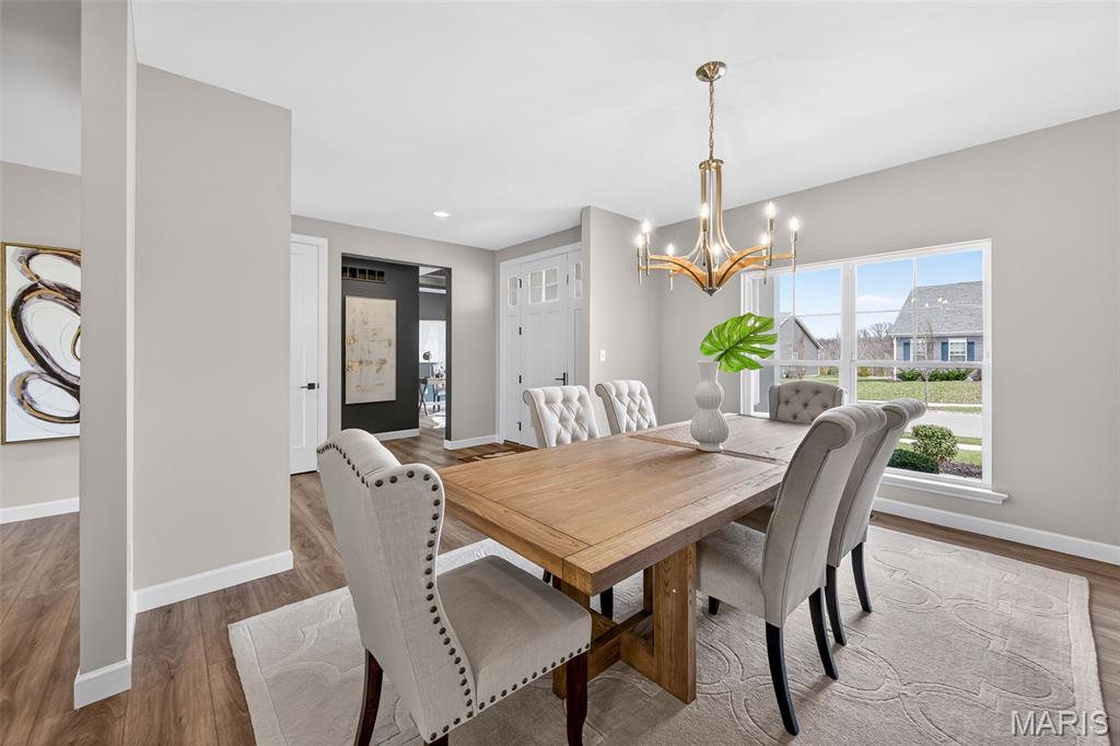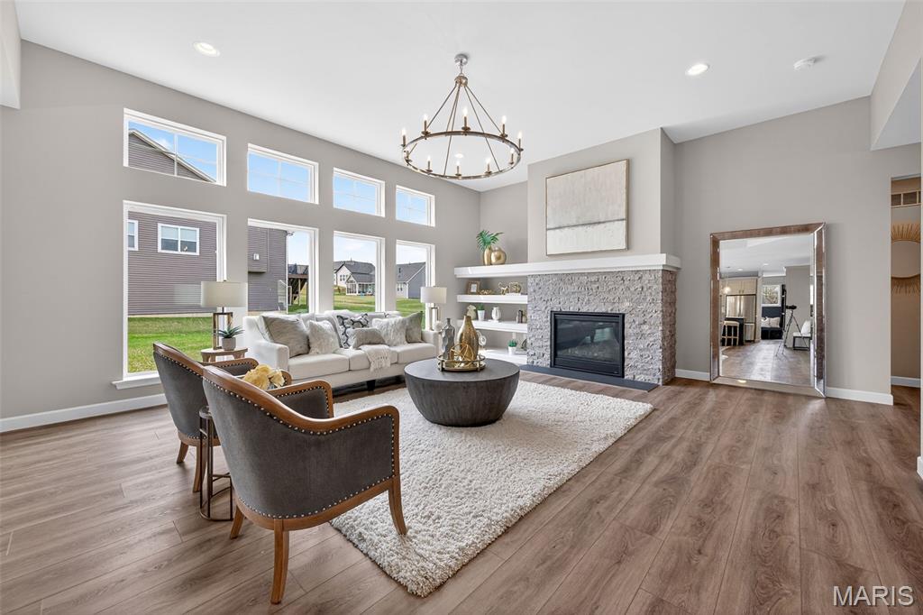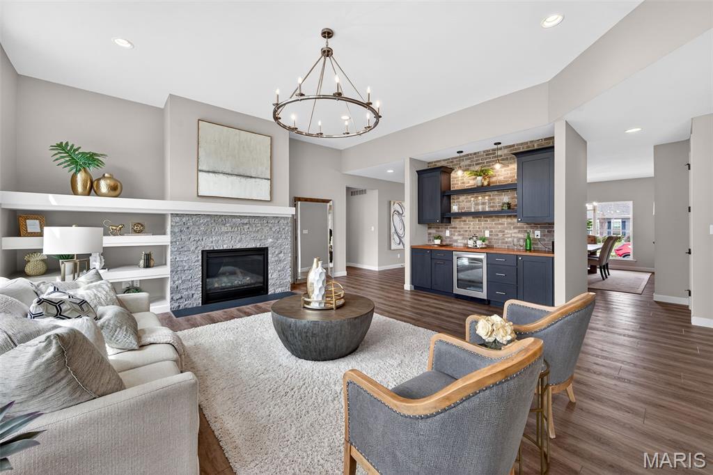 Award winning builder display home now available for immediate move in! This stunning, 1.5 story home will wow you with an amazing use of space and the on-trend finishes and features that todays buyers are looking for. The exterior is captivating with a clean, modern farmhouse-style exterior, architectural shingles, and oversized 3 car garage, professional landscape, lawn irrigation and a covered patio. Features include an impressive designer Kitchen, large island, seating bar, quartz countertops, stainless steel appliances, double oven, gas cooktop, chimney style range hood, tile backsplash, walk in pantry, 9 foot wide sliding door opening to the covered patio, luxury vinyl plank flooring throughout the main, 9 foot ceilings with 11 foot in the Great Room, gas fireplace with stone surround, built in bookshelves, Great Room window wall, entertainment bar/beverage center with accent wall, butlers pantry, Dining Room, Office with a beamed ceiling, 8 foot tall Entry and interior doors, a boot bench and Powder Room off of the Owners Entry, main floor Laundry, MAIN FLOOR PRIMARY SUITE with bay window, shower with seat in the Primary Bath with raised height double bowl vanities, luxury plank tile flooring, walk in closet and a huge linen closet. There is a popular side staircase, wrought iron spindles, exposed stair treads, an upstairs Loft area, three large secondary bedrooms (one with private bath), walk in closets in every bedroom, two full bathrooms, and a large, step-up Bonus Room. Additional features include dual HVAC, two electric panels, Low E windows and a neutral color palette. The basement has a tall pour, an egress window and a bath rough in for an easy future finish if desired. Windsor Park is a lovely community in Lake St. Louis with walking paths, a picnic area, two lakes and easy access to Highways 40/61, 364 and 70. This incredible home is a must-see!