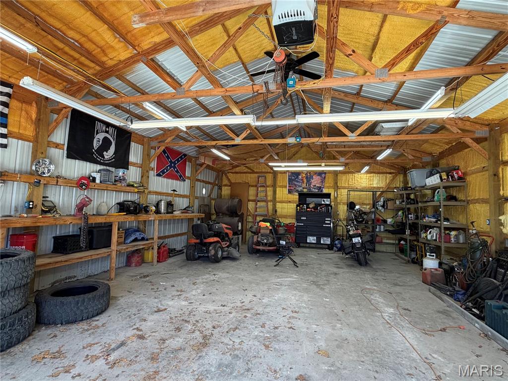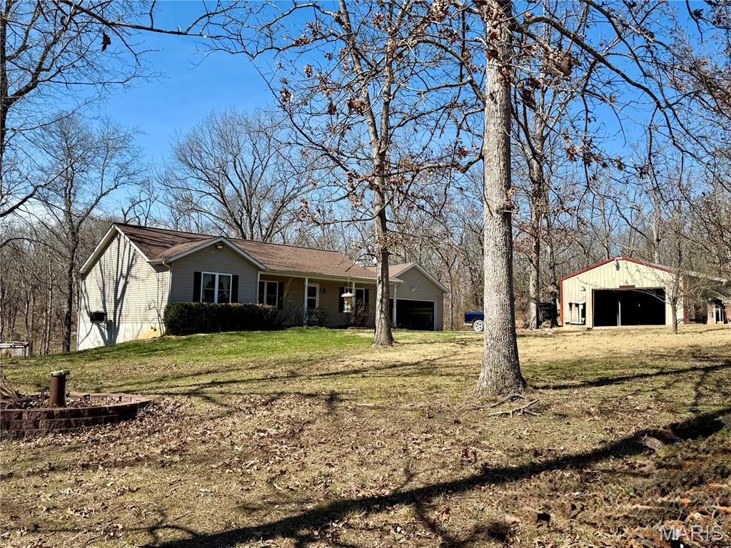 Discover this stunning 4-bed, 3-bath home nestled on 5.5 private acres. It features an above-ground pool, a spacious shop, and a large yard. Inside, you'll find custom oak cabinets coupled with granite countertops & a breakfast bar, along with a dining room that boasts French doors opening to the deck. The family room is generously sized for comfort. The main floor hosts 3 sizable bedrooms, including a master suite with a large closet, double sinks, a jetted tub, & separate shower. Off the kitchen, there's a convenient laundry room equipped with an eco-friendly Pure Wash system. The finished walkout basement is designed for entertaining, featuring a bar area, storm room, and another large bedroom with a full bath. Step outside, and you'll be just steps away from the pool. Outdoor amenities include 2 sheds, an XL carport, & 24x40 metal building with a workshop area with concrete, 220V and LED lighting. Modern comforts are abundant, with the home hardwired for surround sound, a security system, & radiant floor heating throughout. It offers versatile heating options: electric, propane, or wood. Kitchen appliances are included. Recent upgrades include a new well pump & wiring alongside a newer roof. The two-car garage offers accessible attic space via a drop-down ladder. The many flowers and shrubs will soon be blooming.