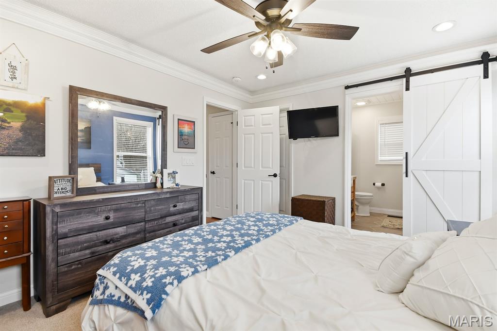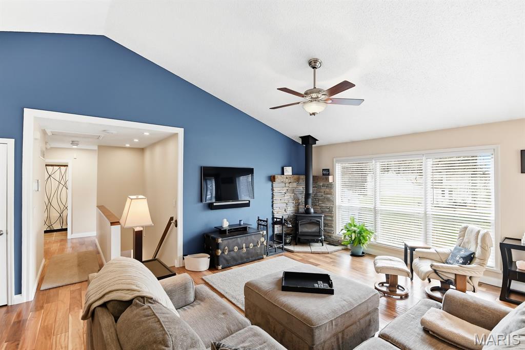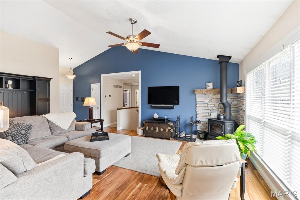 Welcome to this charming 3-bedroom, 3-bath ranch home in the desirable Fox C-6 School District! From the moment you pull up, you’ll notice the home’s great curb appeal. The extra wide driveway and 2-car garage offer plenty of space for parking and convenience. Also note the basketball hoop! Step inside to a bright and open living room featuring vaulted ceilings, large windows that bring in tons of natural light, and beautiful engineered hardwood floors. The cozy stone-accented wood stove creates a warm focal point and adds character to the space. The main floor flows easily into the kitchen and dining area, making everyday living and entertaining simple and enjoyable. The home features two full bathrooms on the main level, including a recently remodeled primary bathroom that looks straight out of a magazine. With its modern tile flooring, farmhouse-style vanity, sliding shower door, and updated lighting, it's a relaxing retreat you’ll love coming home to. Downstairs, the finished basement offers a huge open living area and another full bathroom—perfect for a game room, movie space, home gym, or whatever fits your lifestyle. Outside, enjoy your days on the beautiful deck overlooking a spacious yard. This outdoor space also includes a storage shed, adding even more function and fun to the property. Located in a quiet neighborhood with easy access to shopping, dining, parks, and everyday amenities, this home offers comfort and convenience in a great location. Homes like this don’t stay on the market long—especially ones this well cared for and move-in ready. Schedule your showing today and come see why this lovely ranch should be your next home!