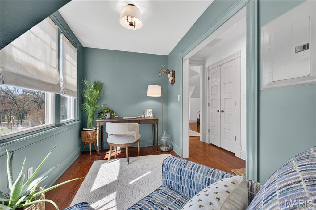 Stunning penthouse condo offering effortless urban living just steps from Tower Grove Park. Perfectly located in the heart of South City, enjoy easy access to Busch Stadium, dining along South Grand Boulevard, and nearby Saint Louis University and Washington University in St. Louis. Inside, an open floor plan features vaulted, beamed ceilings, hardwood floors, and abundant natural light. The updated kitchen boasts custom cabinetry, granite countertops, stainless steel appliances, a center island, and seamless flow for entertaining. The spacious primary suite offers great closet space, while a versatile den is perfect for an office or guest room. Enjoy in-unit main-level laundry, a shared balcony, courtyard, and garden spaces, plus a full unfinished basement with a private extra storage room. Located on a corner lot near parks and public transit, this home blends charm, comfort, and convenience.