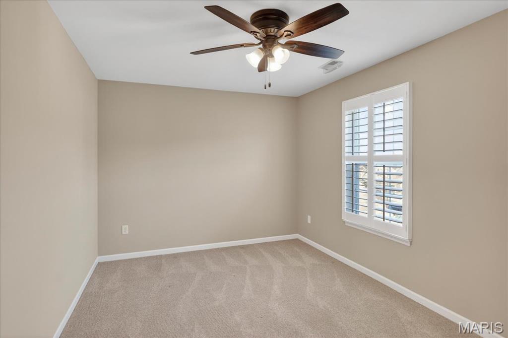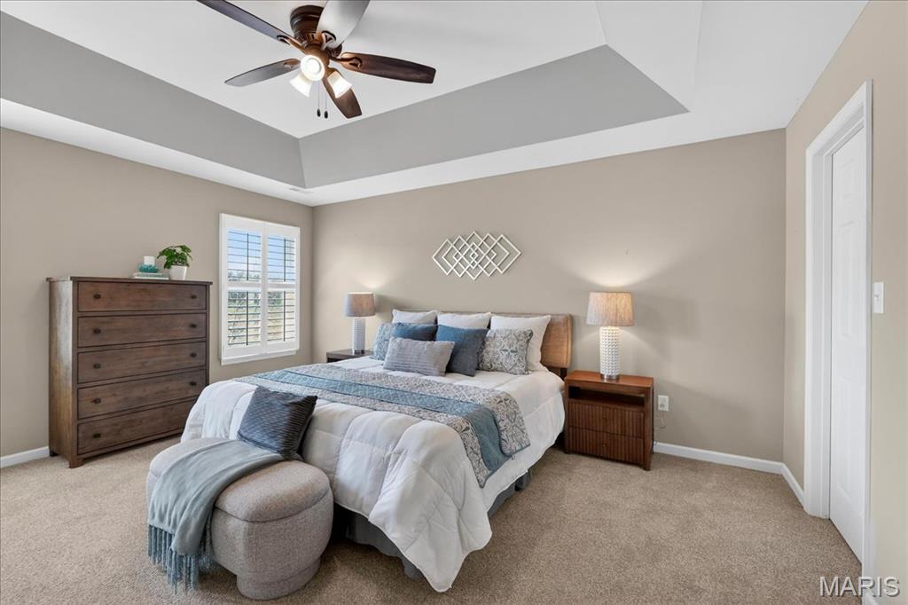 Welcome to this beautifully updated 2BR/4BA Villa nestled in a quiet, desirable neighborhood with easy access to Highway 270, shopping, and grocery stores—offering both convenience and comfort in one exceptional package. The exterior boasts low-maintenance vinyl siding with an attractive brick front, covered soffits, and a welcoming covered front porch. Enjoy peaceful views from the private back patio overlooking a serene pond, along with the convenience of a spacious two-car garage. Step inside to a bright, open floor plan featuring wood flooring, updated hardware, and classic six-panel doors throughout. The large Family Room is filled with natural light and enhanced by plantation shutters, modern lighting, and seamless flow into the kitchen and breakfast area—perfect for both everyday living and entertaining. The Kitchen is a standout with wood flooring, quartz countertops, a stylish tile backsplash, and a peninsula island with seating. You'll also find stainless steel appliances, a smooth-top electric range with double oven, 42-inch cabinetry, and recessed (canned) lighting. Convenient access to both the garage and back patio makes daily living effortless. Upstairs, the spacious Primary Suite offers newer carpeting, plantation shutters, a coffered ceiling with ceiling fan, and two large walk-in closets. The En Suite bath features a comfort height double sink vanity, linen closet, and an oversized walk-in shower. The second bedroom is generously sized with carpeting, shutters, a ceiling fan, and its own walk-in closet. The finished lower level expands your living space with cozy carpeting, recessed lighting, plantation shutters, an egress window, and a convenient half bath. You'll also find an electric washer and dryer hookup and a brand-new water heater installed in 2026. Thoughtfully updated and tastefully decorated, this villa offers modern finishes, functional space, and low-maintenance living—all in a fantastic location.