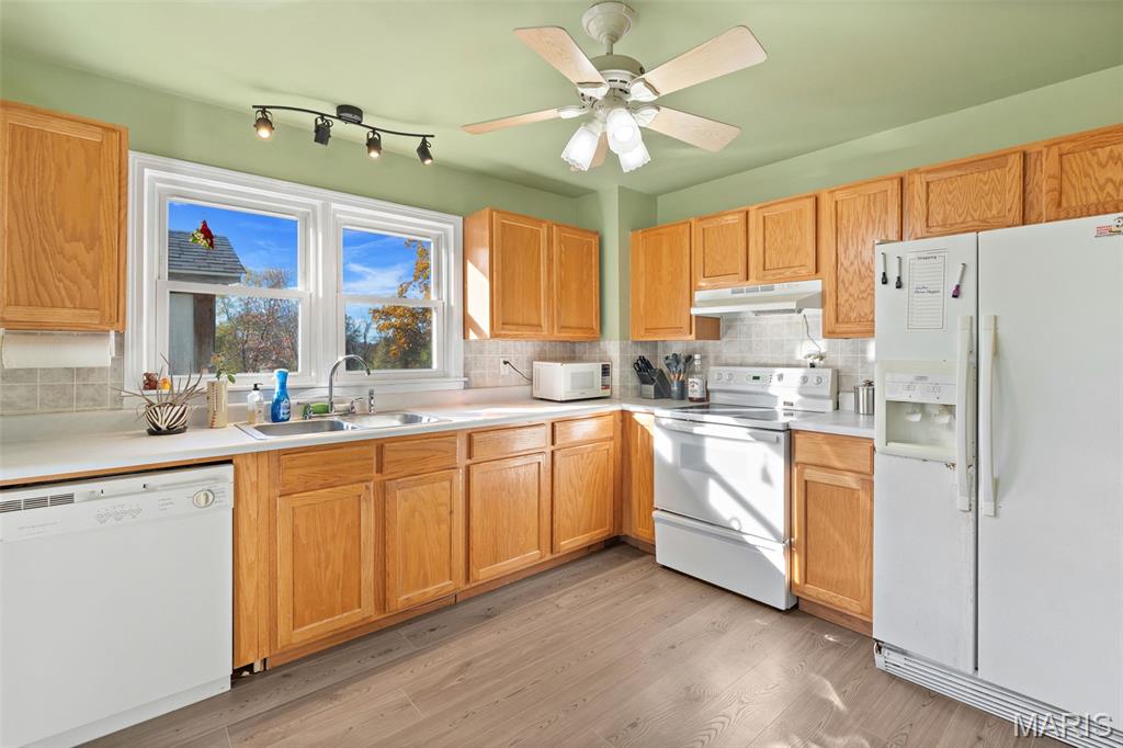 Just outside of city limits but close to everything, this home offers a spacious 3/4 acre yard, lots of parking and a 1400+ square foot home ready for new owners. Inside you will be greated in the family room with a bonus space under the stairs, perfect for your home office or hobby space. You will find wood floors in the formal dining room & main floor bedroom. The main level also boasts the kitchen & laundry area and both full bathrooms. The kitchen appliances (stove, dishwasher, refrigerator & microwave) are included in addition to the washer & dryer. Upstairs you will find the spacious primary bedroom (TV & mount included) and 3rd bedroom. Great news: roof is only 2 years old! If you run your business from home and need outdoor space, this could be it. The property is already equipped with and wired for surveillance cameras & includes the indoor TV monitor. You just need your own connection box. The detached garage has a concrete floor and electric. No basement here but there is a side bump-out storge box specifically for the water softener and well controls. There is also an outbuilding that was the old cistern. Flooring, siding, bathrooms have been updated throughout the years. This country setting hasn't been available for 19 years and is now waiting for you.