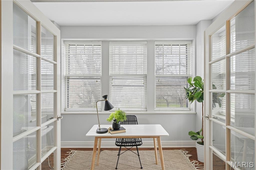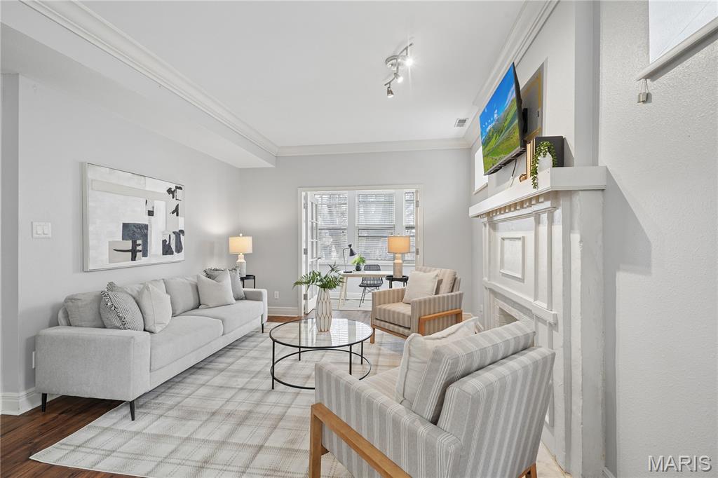 A large 3 bedroom, 2 bath updated condo with a GARAGE?! Wow!! Units like this don't come along very often. Wonderful charm and open flow in the living room and dining room with a decorative fireplace, high ceilings and crown molding plus French doors that lead to the darling front bonus room with windows on 3 sides. It's a perfect office or reading nook. There are gleaming floors throughout the living spaces and newer carpeting in the bedrooms. You'll love all the natural light and closets everywhere. The kitchen has a new tile floor, granite counters and breakfast bar and stainless appliances. The primary suite features a walk-in closet, full bath with jet tub and another bonus room with French doors. So luxurious! The 2nd and 3rd bedrooms can share the other updated full bath. It's an amazing set up for roommates or anyone looking for a condo that feels like home, not just a glorified apartment. In-unit laundry, All appliances stay! The icing on the cake is the very rare private GARAGE and additional parking spot on the secure lot. A spacious condo with TWO parking spaces!! This is the one you've been waiting for. A/C is new in 2026, furnace '20, the building just got a new roof too. All in a fantastic location close to Forest Park, the Metro stop, Wash U, and BJC, restaurants and more.