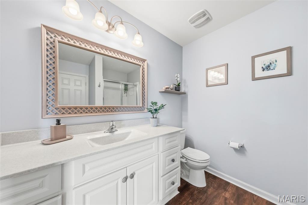 Charming 1.5-Story Home with Main Floor Primary Suite – Move-In Ready! Welcome to this beautifully maintained home offering 1,472 sq. ft., 3 bedrooms, 2.5 baths, and a 1-car garage. The main level features luxury vinyl plank flooring throughout and an abundance of natural light thanks to additional windows that create a bright and inviting atmosphere. The kitchen showcases white cabinetry, quartz countertops, and stainless steel appliances. The main-floor primary suite offers a spacious walk-in closet and a private bath featuring a adult height vanity & stand-alone shower. A laundry room and powder room complete main level. Upstairs, you’ll find two additional nice size bedrooms w/ lots of closet space and a full bath. The lower level is ready for your unique design or serves as excellent storage space. The 1-car garage is insulated, paneled & heated, along with a long driveway, offers ample parking. Step outside to enjoy the extended patio and fenced in backyard. The yard is immaculate & the grass is really this green! Nestled in one of the area’s most desirable communities, this vibrant neighborhood called New Town @ St. Charles offers resort-style living at its finest — featuring pools, including 700-foot lazy river. Enjoy scenic lakes and canals ideal for fishing, swimming, floating, kayaking, and paddleboarding, along with an amphitheater, popular restaurants, volleyball and pickleball leagues, a grocery store, coffee shop, bakery, charming shops, and so much more!